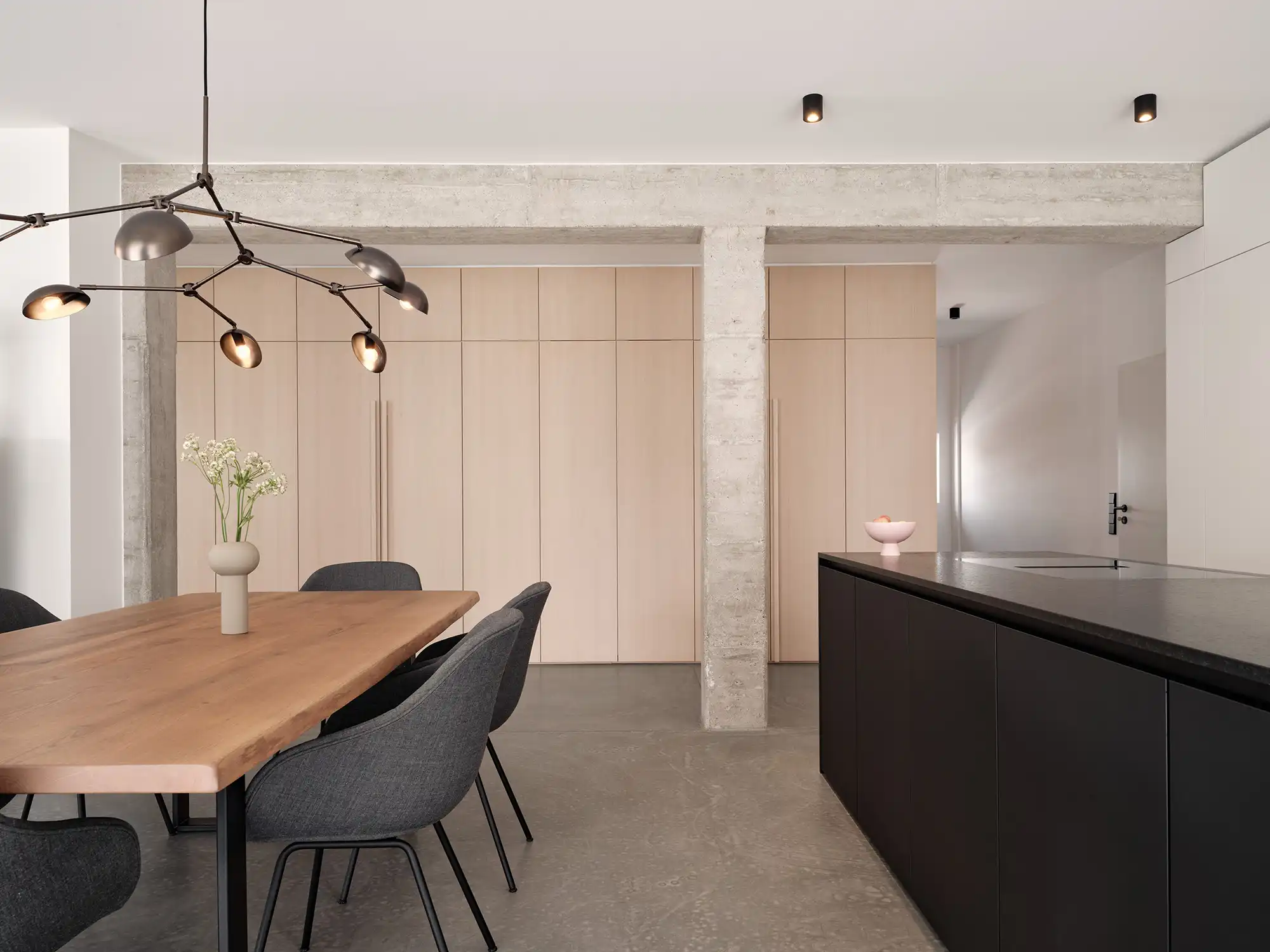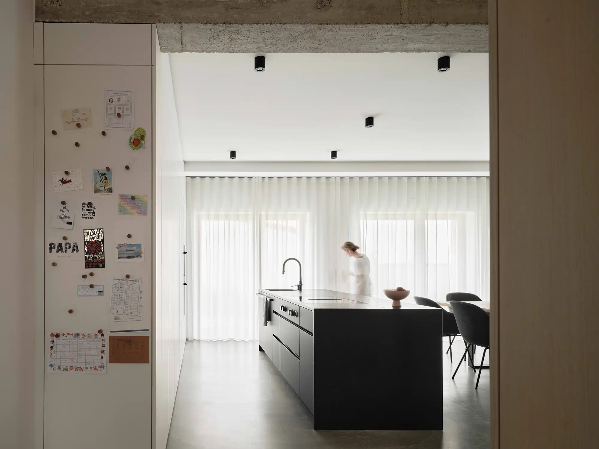 Wir durften den kompletten Innenausbau für die Bereiche Flur, Garderobe, Küche, Büro und Treppe übernehmen. Die Küche ist als zentrales Element in Schwarz-Weiß gestaltet: Weiße Hochschränke verbergen eine Kaffeenische aus heller Esche hinter Pocket Doors, während die schwarze Kochinsel mit ihrer Naturstein-Arbeitsplatte aus Nero Assoluto einen markanten Kontrast setzt.